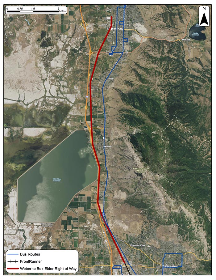The 2019-2050 Regional Transportation Plan identifies the need to preserve the corridor between Ogden and Brigham City for future transit service. See https://wfrc.org/vision-plans/regional-transportation-plan/2019-2050-regional-transportation-plan/ for more details.