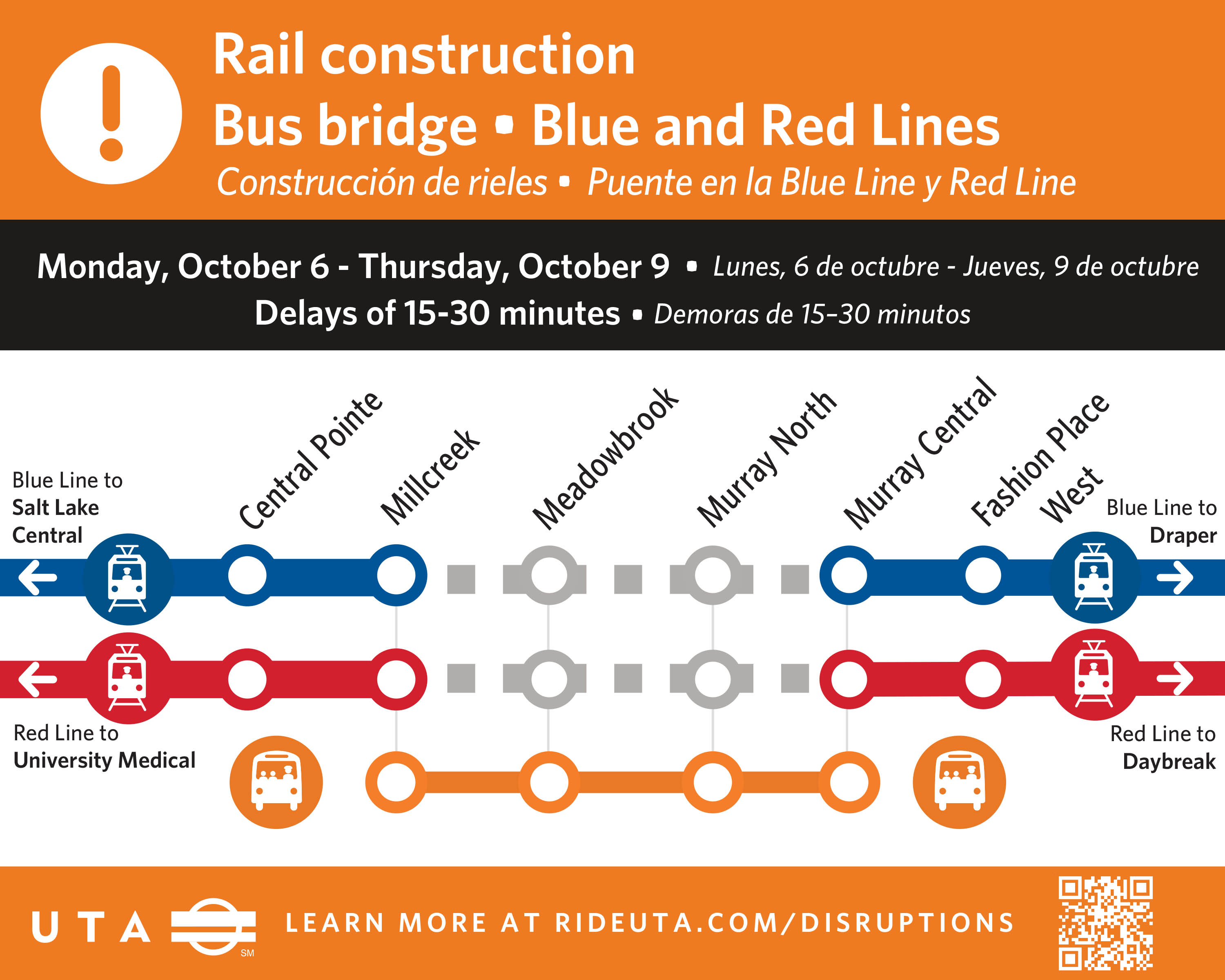 A bus bridge will be available to shuttle riders between Millcreek, Meadowbrook, Murray North, and Murray Central stations.