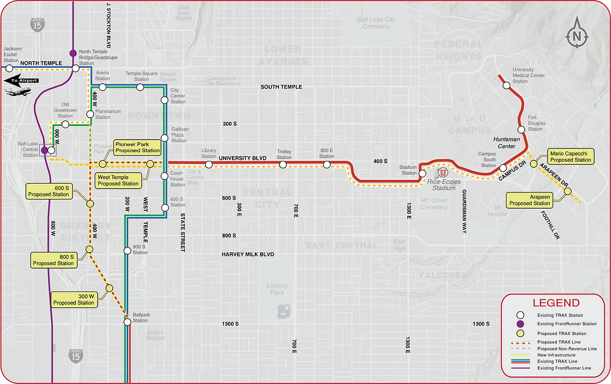 Proposed Light Rail Improvements in the TechLink TRAX Study Include Enhancements to Existing Lines and a New Line From the Airport to the University of Utah Research Park